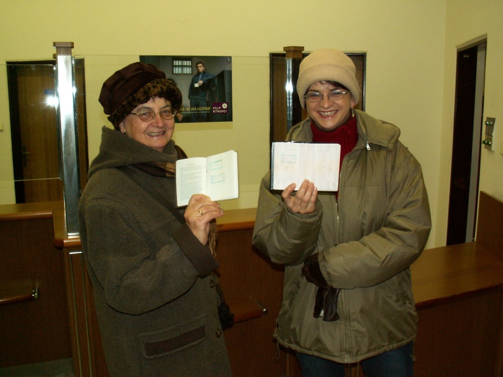Minął rok od wprowadzenie układu z Schengen w naszym kraju. Na zdjęciu pani Helena Bartoszek wraz z córką pokazują ostatnie, teraz juź pamiątkowe pieczątki wbite do paszportu w tym dniu... za kilka minut po wbiciu tych pieczątek zniknęła kontrola graniczna w starym tego słowa znaczeniu. Foto: crasher dodano: 2008-09-27 22:31:13