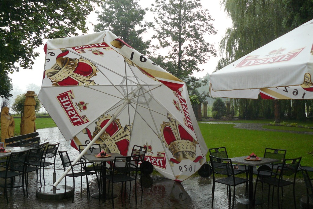 W ostatnim czasie doświadczamy huraganowych wiatrów i obfitych opadów deszczu. Jak twierdzą meteorologowie, to efekt zmian klimatycznych na naszym globie. Coraz częściej mają nas dotykać tropikalne upały a co za tym idzie i burze.Efekt dzisiejszej burzy przy zamku w Zebrzydowicach (ogródek restauracji Castello). Fot: Crasher dodano: 2008-07-25 14:24:37